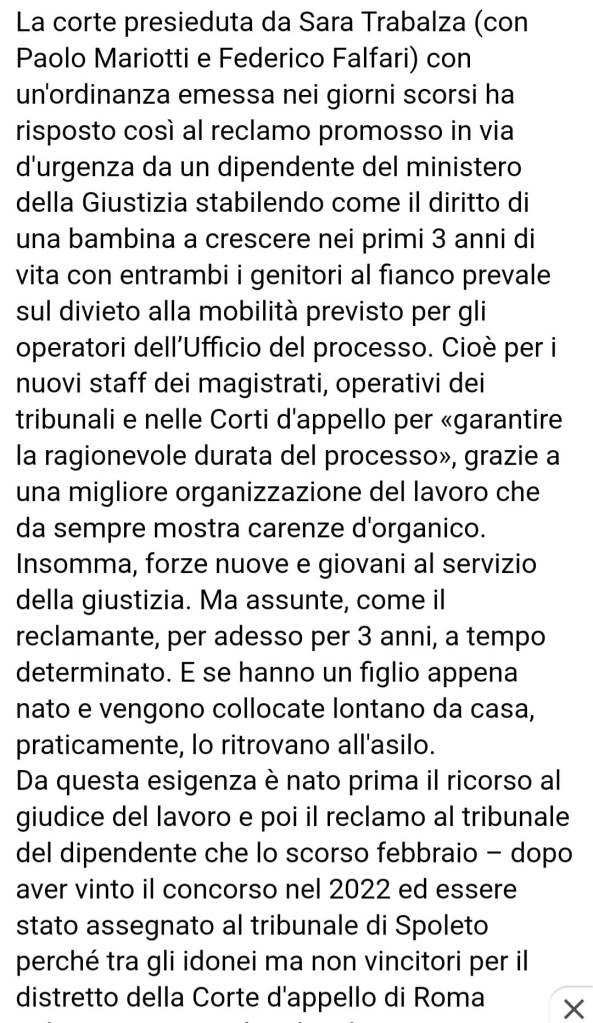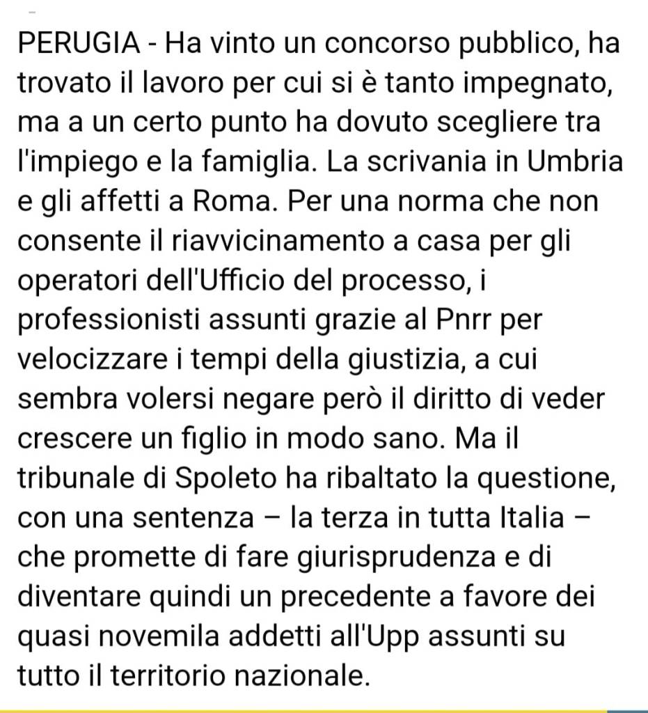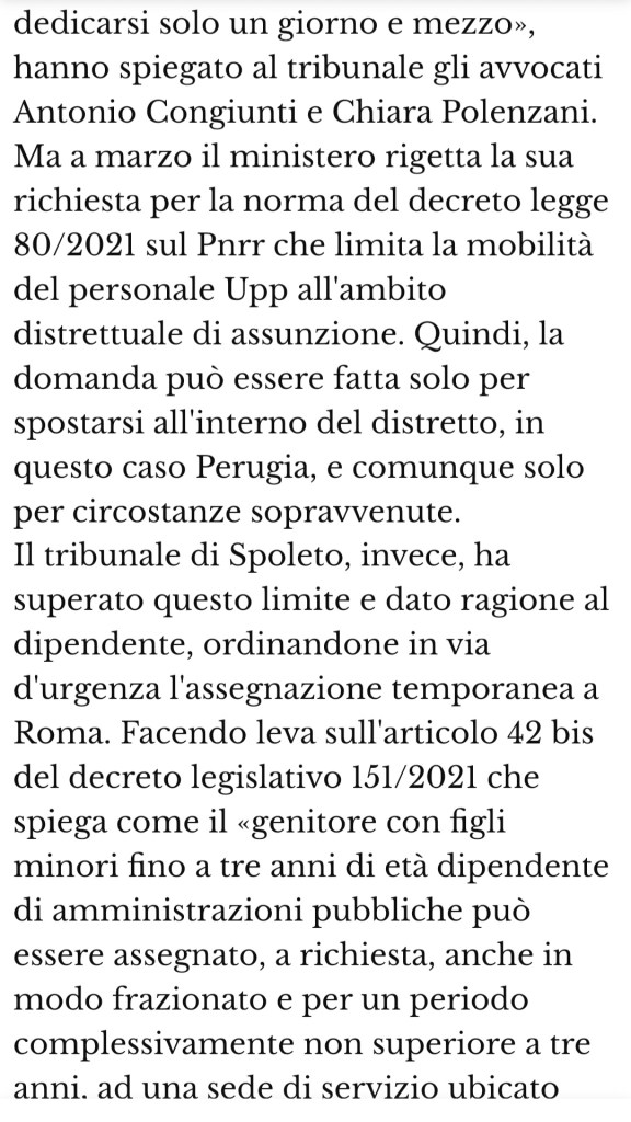 Si può ottenere il trasferimento in deroga al decreto legge 80/2021 dal proprio distretto di assegnazione al distretto di residenza in nome dell’art.42 bis del dlgs 151 /21 secondo quanto stabilito dal Tribunale di Spoleto, terzo caso di esito positivo in Italia secondo quanto riportato dall’edizione Umbria del Messaggero e che riporto di seguito